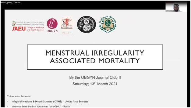 В марте 2021 года состоялось очередное онлайн-заседание Молодежного гинекологического студенческого клуба (The 2 Journal Club) Колледжа медицины и медицинских наук Университета Объединенных Арабских Эмиратов на тему: «Влияние нарушения менструального цикла на продолжительность жизни женщин» под руководством профессора Моамар-Эль-Джефута.